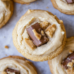- Once cookies are fully cooled, frost with a swirl of caramel buttercream using a spoon or piping tip.