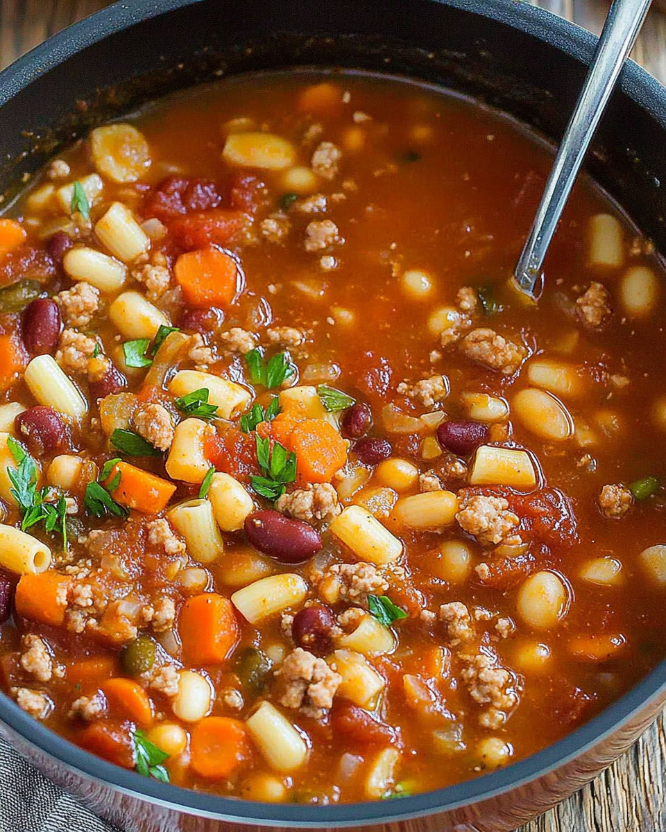 Pasta e Fagioli is a classic Italian soup that translates to “pasta and beans.” This Olive Garden-inspired version takes that traditional foundation and elevates it with savory ground beef, tender vegetables, a flavorful tomato broth, and a comforting addition of ditalini pasta. It’s a satisfying one-pot meal that balances protein, fiber, and robust Italian seasoning in every bite.